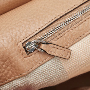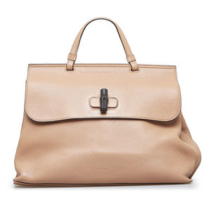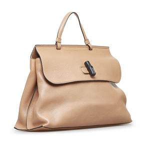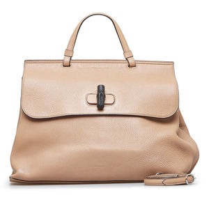The Daily satchel features a leather body, a flat top handle, a detachable flat strap, a front flap with a bamboo bullet twist lock closure, and interior zip and slip pockets.