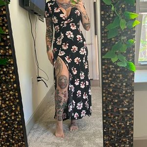 Adorable flower dress with a sexy little slit. Super flattering to the chest. Over all sits very well. Runs slightly small.