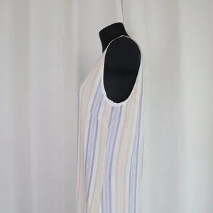 The Danna Maxi dress from Anthropologie brand, Sadie & Sage is a pale striped maxi dress with button detail and a 90s flare. Featuring a v-neck, sleeveless cut and lining.