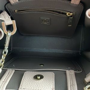 This Ann Taylor Leather Bag features lots of gold hardware and a gold chain.