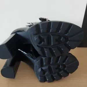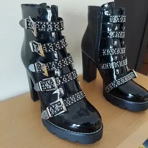 Azalea Wang Studded Black Patent Ankle boot. Man made an upper shaft. Silver metalic grommet staps. 4.5" chunky heel with a 1.5" platform.