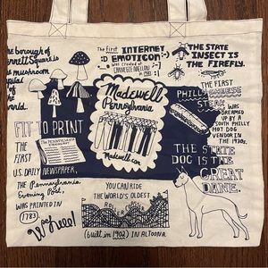 NWOT lightweight Madewell cotton canvas tote in natural with navy blue screen print of Pennsylvania icons and facts. 14” x 16” with 10” handle drop. Bottom is not square but this could hold library books, snacks and a water bottle, farmer’s market goodies… the list is endless! Great gift for a current or former PA resident—or use it to wrap and present a gift of soft pretzels or local beer. Smoke- and pet-free home. Make an offer!