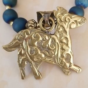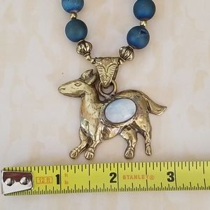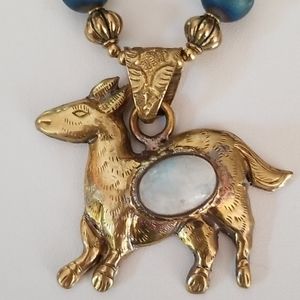 Tibetan handmade gold tone brass animal figural pendant features a large genuine Moonstone.