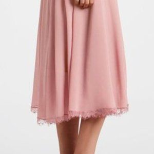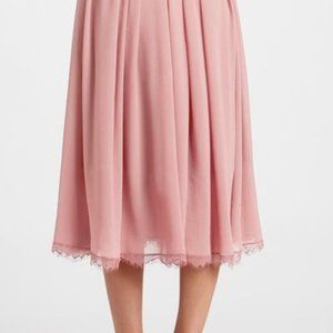 Offering textural contrast in a monochromatic palette, this versatile party dress pairs a fitted crepe bodice with a softly gathered chiffon skirt. Slender straps and a plunging neckline highlight luminous skin, while a scalloped eyelash lace hem makes a romantic finish.
