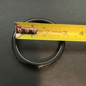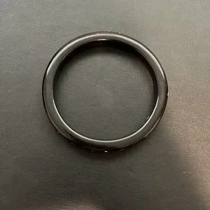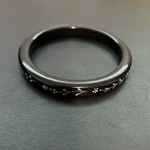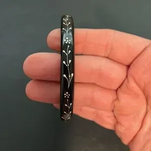 This vintage black plastic bangle bracelet has a painted white floral design on the exterior. The measurement of the opening in shown in the photos. The bracelet shows normal light wear, but it is generally in good condition. From a non-smoking home.