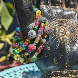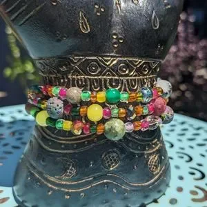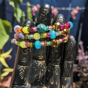 Colorful Jasper Opal Lava Stone Crystals Gemstone Handmade beaded coil bracelet created with silver plated memory wire Summer Vibes Warm Hot Bright Fun Cute Artisan Art Beaded Stacked Festival Concert Statement piece