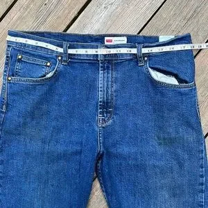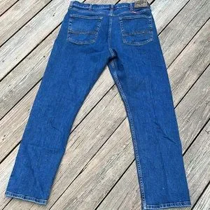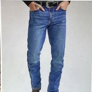 Designed with a closer fit and leg opening that still falls comfortably over boots. The slim fit jeans add extra style to the classic look. These jeans have a 36” waist and 29” inseam. Traditional 5-pocket design. Some stretch.