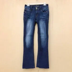 Great looking, NWOT, Wallflower dark wash bootcut stretch distressed jeans. Size 7. Contrast stitching. Classic 5 pocket styling with embroidered button / flap back pockets. Button / zip fly. Dark wash with factory distressing / whiskering. Fabric is 80% cotton / 19% polyester / 1% elastane (has stretch). Brand new without tags. Comes from a non-smoking home.