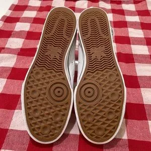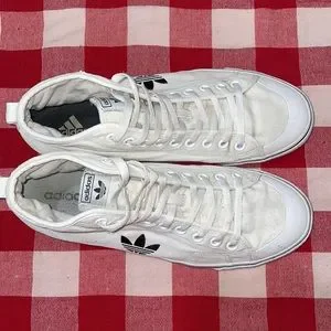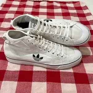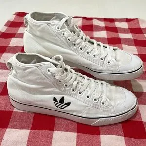 Adidas Nizza RF Hi white cotton canvas classic basketball shoes. Men’s size 13. Excellent condition. Padded tongue and collar for supreme comfort. Heel pull-up tab. Rubber soles are extremely tacky for gripping the hardwood. One eyelet missing on instep air holes as shown in photos, otherwise flawless uppers are gleaming white and soles show barely a hint of wear at heels. Mega mileage left in these babies! Please see photos for full details and comment with any questions. Thanks for looking and please tell your friends. All love, love all!