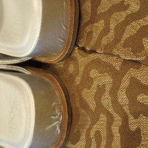 "Soft" silver slip on leather sandals with rubber soles. The back of the heel , the leather was glued down with a wrinkle in the leather. The photo looks like a tear, but is not. These sandals are in new condition.