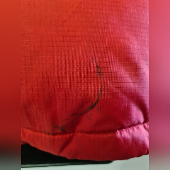 Quiksilver Red puffer body warmer There is a mark at the bottom on the back, see photo Down filled  50% down 50% feather Zip fastening Pockets Size large Under arm to under arm approx. 22" Centre back length approx. 36.5"