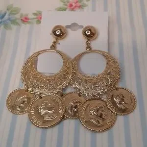 Gold Napoleon Faux Coin Filigree Dangle Pierced Earrings