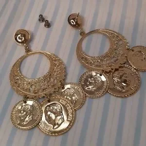 Gold color Napoleon faux coin filigree hop dangle pierced earrings, unknown maker, nice condition, lots of movement, jingly, very pretty