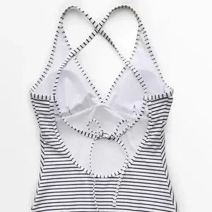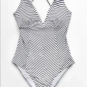 New with tags. Classic Black and White Stripe V-Neck One-Piece Swimsuit is a must-have for every body. The figure flattering silhoutte draws attention to the chest and upper body with a v-neckline and full-adjustable straps that criss-cross at the back. Padded cups add support and comfort.