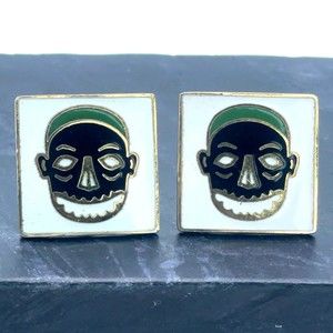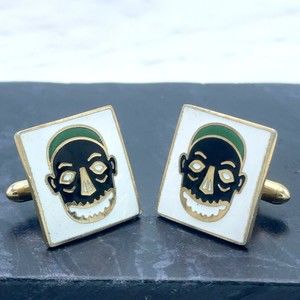 Vintage Swank Tribal Mask White Black Green Enamel Gold Bullet Back Cufflinks