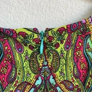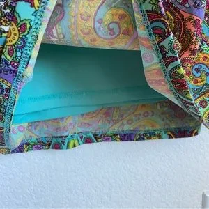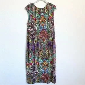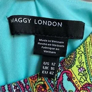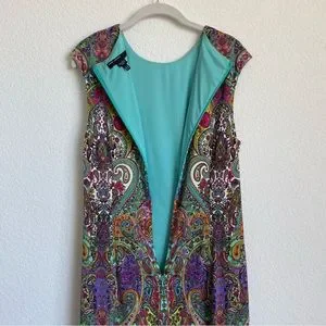 Maggy London paisley print sheath dress with rear zipper. Slight sheen. Lined. Stretches. Pit to pit: 18”-21” / Waist: 16.5”-17.5” / Hips: 20”- 22”) / Length approx 44”.