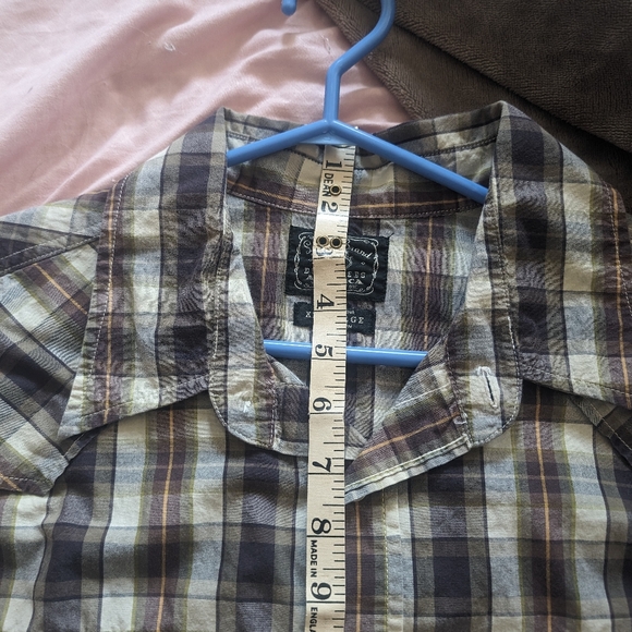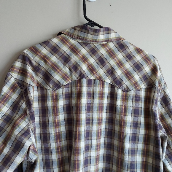 Awesome Lucky Brand Western shirt in brown and tan checker. Double snap on front pockets. There are 3 snaps at the cuff.