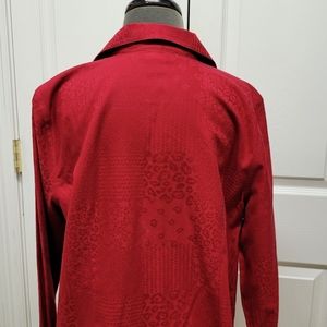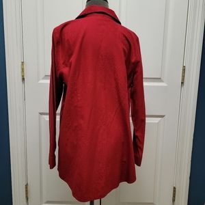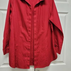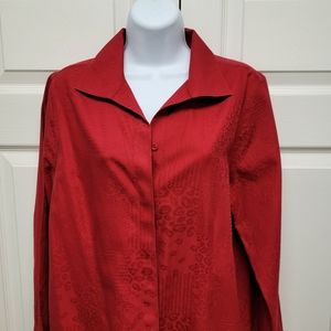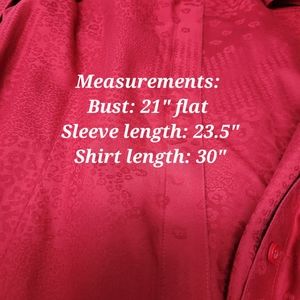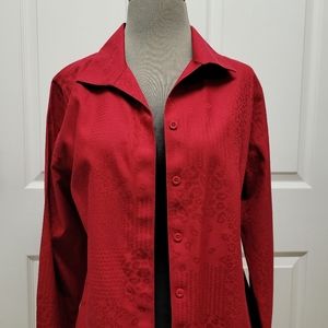 It's a beautiful Jacquard Brocade red top with long sleeves and a long rounded hem with side splits. Collared shirt. I would wear with a tank or cami, roll the sleeves, and wear open down the front. Long enough to be a tunic. Excellent condition!