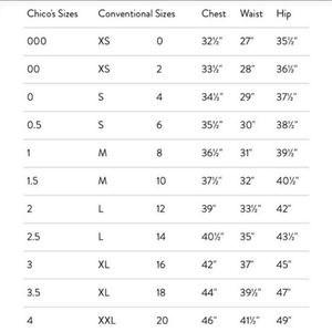 Chico's Size One equals a regular size Medium. See conversion chart for sizing and see last pic for measurements.