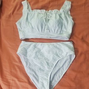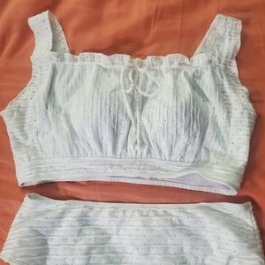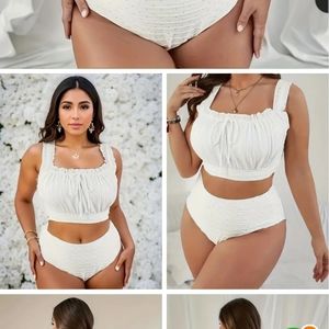 New with tags, all white very cute fashion 2 piece swimsuit, slight stretch, fully lined with additional cup inserts, 95% polyester 5% elastane, bust is 48", sexy drawstring top. 3xl or sz. 18