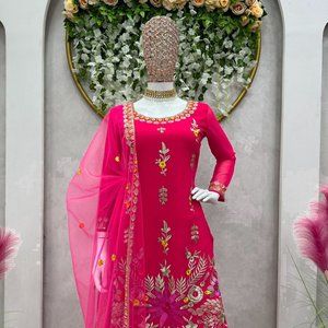 Looking for this same colour beautiful Designer Suit on Faux Georgette Febrics with inner and Thred with Sequnce work and sharara on also Faux Georgette Febric with inner and Dupatta on Soft Net febric with Thred and Sequnce work.