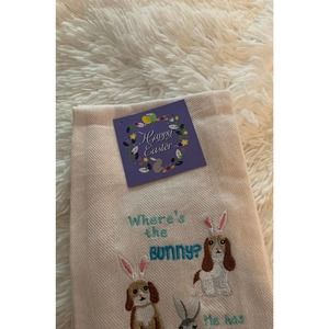 Brand new with tags set up to 100% cotton kitchen towels where is the bunny he has a chocolate stitched adorable whimsical design has a bunny sticking out of Easter basket and 2 adorable dogs looking on light beige also includes second kitchen towel pinstripes comes from smoke free home perfect For Easter and spring