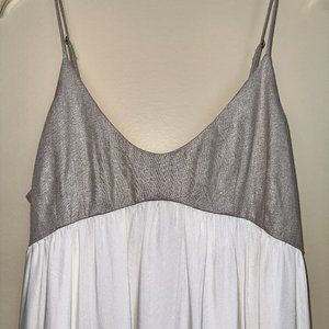 L'AGENCE's almost vintage, off-white maxi dress with silver top has adjustable spaghetti straps, on a textured, silver speckled woven bralette style top. Can be considered empire waist gown. The bottom of this dress is an ivory/cream color made from a silky type material. Please note that this dress has no internal tag other than the L'agence name tag. Extensive research provided nothing on this dress, it's more than13 years old, yet brand new with tags. It was purchased in Neiman Marcus, Boca Raton ( I believe, many many moons ago) as you can see by the tag. This Beautiful gown is fully lined, has a back slit, has a hidden rear zipper with hook and eye closure, and best of all, two pockets at the hip. A truly stunning piece that you can be sure no one else at the event will be wearing. Can easily be dressed up or down. 🥂