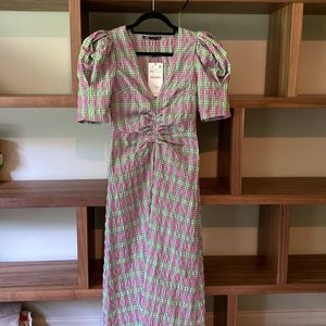 Zara Pink/Green Long Dress with puffy shoulders and synched waist.