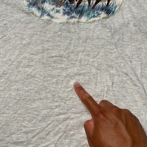 Slight blemish on front and sleeve of shirt, also small hole in front of shirt (see photos)