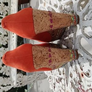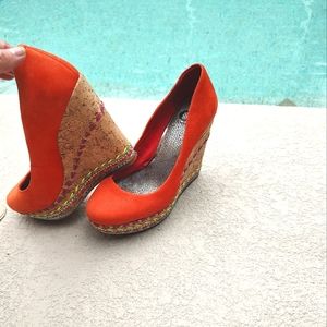 Stunning orange wedges with colorful bead work and studs.Round toe slip ons.I have pointed out a few minor flaws as shown a light scuff mark and on one side where you step on is slightly turned on a tad.Please contact me with any questions you may have! Leather upper