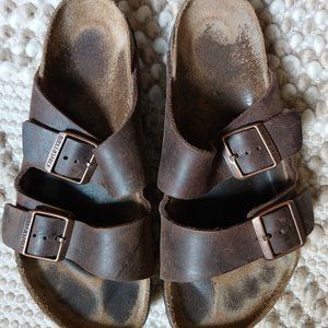 US 9-9.5 Women's Birkenstock Arizona sandals, colorway "Oiled Leather - Habana" with dark chocolate leather straps, rose gold/copper buckles.