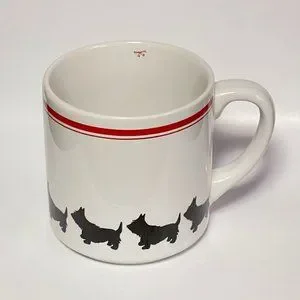Adorable Black Scottie Dogs Coffee Mug/ Tea Cup 12 Oz White with Red Stripes and a cute red bow on the inside lip of the mug. This is a cute vintage mug in great condition. View photos as they are part of the description, any questions please ask. Set of 3 vintage