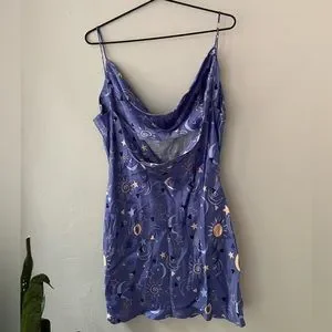 Color: Lilac (w/ yellow, black, light purple, and white accents) - Cute and colorful celestial print throughout - Spaghetti straps (non-adjustable) - Mini length - A-line silhouette - Fluid, drape neckline - Satin-like fabric - Material: 100% Viscose - Condition: NWT