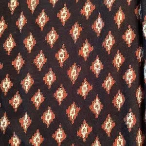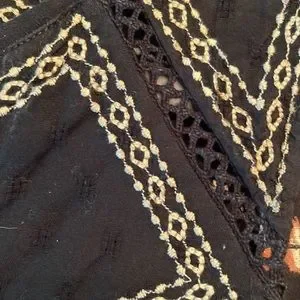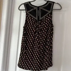 Lucky Brand top, size M, black, brown and cream colored aztec style print, embroidered ‘lace’ look on yolk. Very loose, ‘flowy’, and cool! Machine wash cold. Slight ‘V’ neck at top of yolk. 18 in pit to pit, 27-1/2 in shoulder to hem, 24 in across at hem. From a smoke free, pet free home.