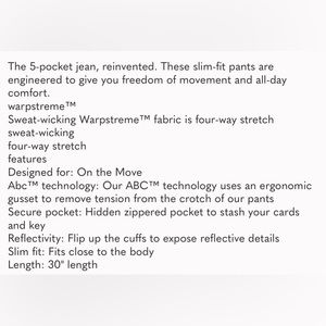 Measurements: Rise 10 inches, Inseam 30 inches and waist 15.5 inches. Black, Size 30. More details in description from Lululemon website. Great for golf but also as a dress pant. Smoke and pet free home.