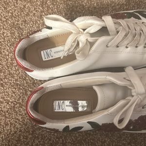 INC International Concepts sneakers. Red and gold sequins roses and green embroidered leaves. White sneaker base. Size 8