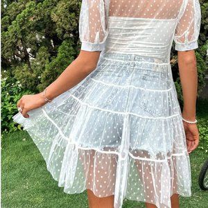 White Boho Womens Polka Dot Puff Sleeve Ruffle Hem Sheer Mesh Dress