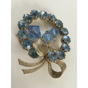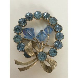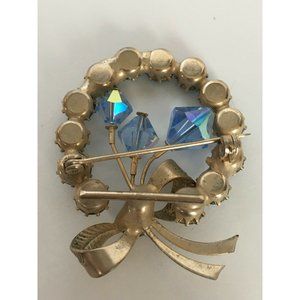 Vintage Wreath Pin Brooch Jewelry Blue Glass Aurora Borealis Iridescent Bow