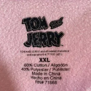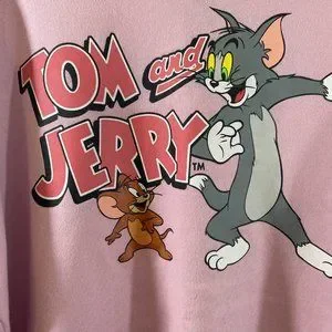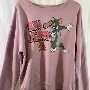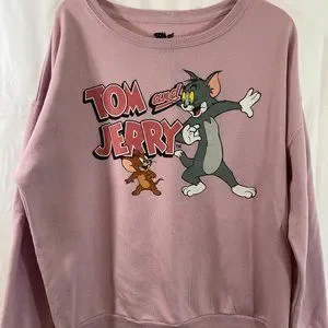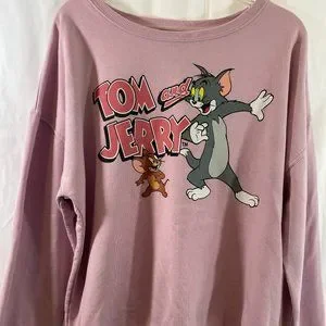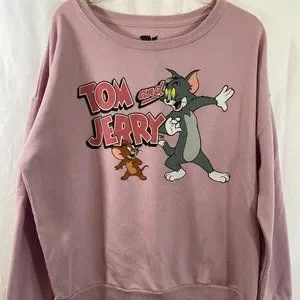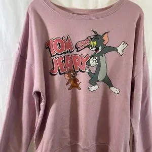 Muted pink long cuffed sleeve pullover lightweight sweatshirt with Tom and Jerry cartoon applique front and center. 60% Cotton, 40% Polyester. Machine wash inside-out, cold water gentle cycle and tumble dry low heat.