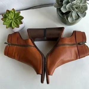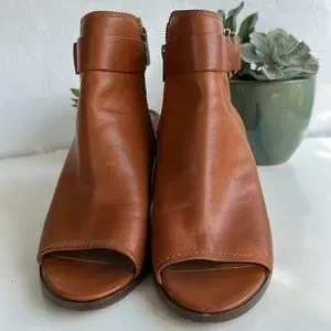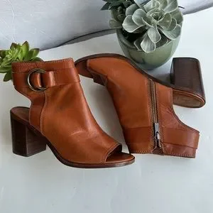 Sleek bootie silhouette with antique brass hardware and peep toe design.