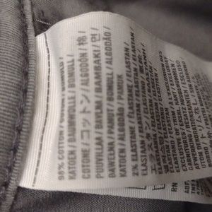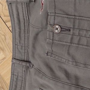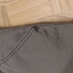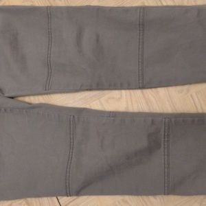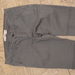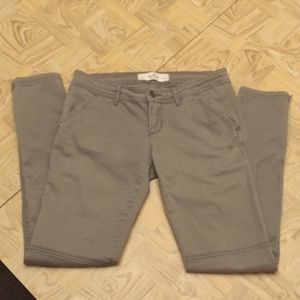 Hollister brand skinny jeans. greenish gray. two front pockets. back pockets close with buttons. some threads could be tidied up as pictured. horizontal seams around knees. size 5/ w27