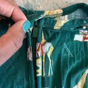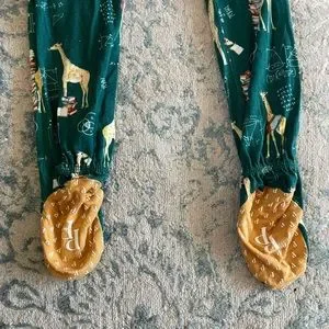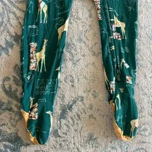 Posh Peanut footed pajamas in giraffe, math, geometry print on dark green background with yellow gold accents
