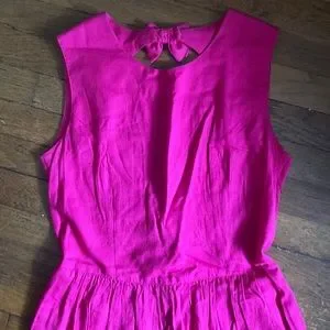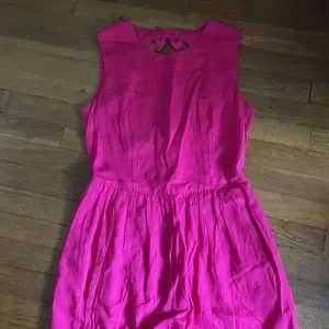 Here's a great dress for a summer wedding.. or just channeling Barbie! Bright pink linen rayon blend with a cutout back and bow at the neck. Back has buttons above waist and a zipper below.