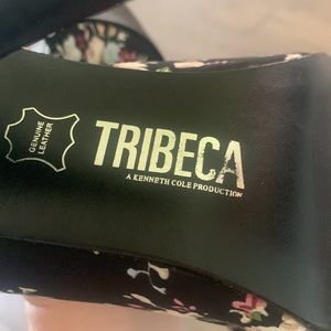 Never been worn (NWOT) Kenneth Cole (Tribeca) open toed 4inch stiletto heels in black satin and floral print size 9. Parisian style print with rhinestone buckles on each side of shoe. Please see pictures, bought in Dallas years ago and have been stored in my closet ever since and time got a new home, as I no longer wear heels this high.