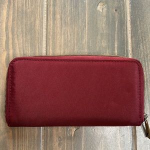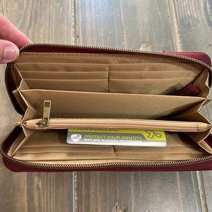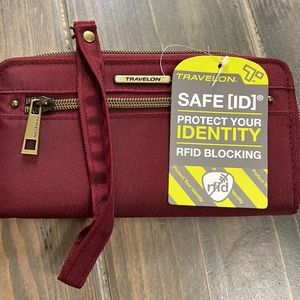 Unused nice Travelon RFID blocker wallet- dark red/burgundy color. Inside and outside zipper pockets. Clear ID pocket.