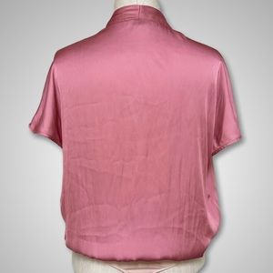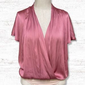 Short sleeve bodysuit crafted of satin with a flowy, draped bodice and surplice neck, in great condition.