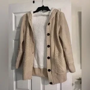 Size small. Sherpa fleece on the inside, button down front. Super cozy!