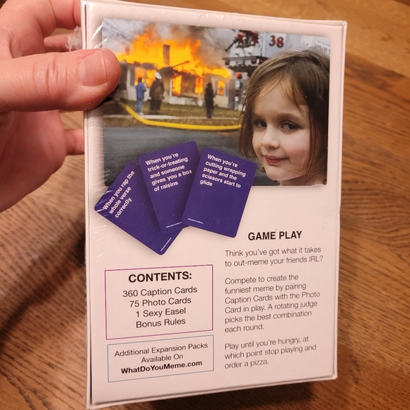 Compete with your friends and family to create the funniest memes; Do this by using one of your dealt caption cards to caption the photo card in each round
