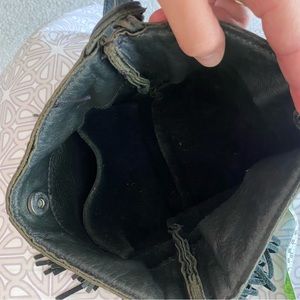 McFadin black leather crossbody style purse with black leather fringe. Has one small inside side pocket and buttons closed at the top. The overall look of Thai bag is a “worn in” or “vintage” look. The leather is very soft and slouchy. There is some fading/tarnishing of the hardware.