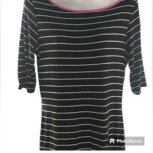 2.Green Envelope Los Angeles-Medium, black/white stripes with pink collar accent. Length-25”, pit-pit-18”, sleeves-7.5” long. Polyester/spandex, machine washable